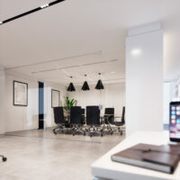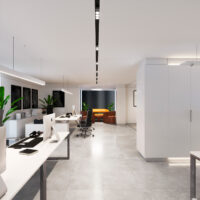 Diseño, desarrollo y fabricación de mobiliario para unas oficinas ubicadas en Madrid. El espacio se compone de varias zonas de trabajo común, una sala de reuniones y una zona de espera. Todas las paredes van forradas con paneles y armarios empotrados en lacado blanco, distinguiendo estos últimos por la iluminación LED ubicada en cornisa y rodapié.